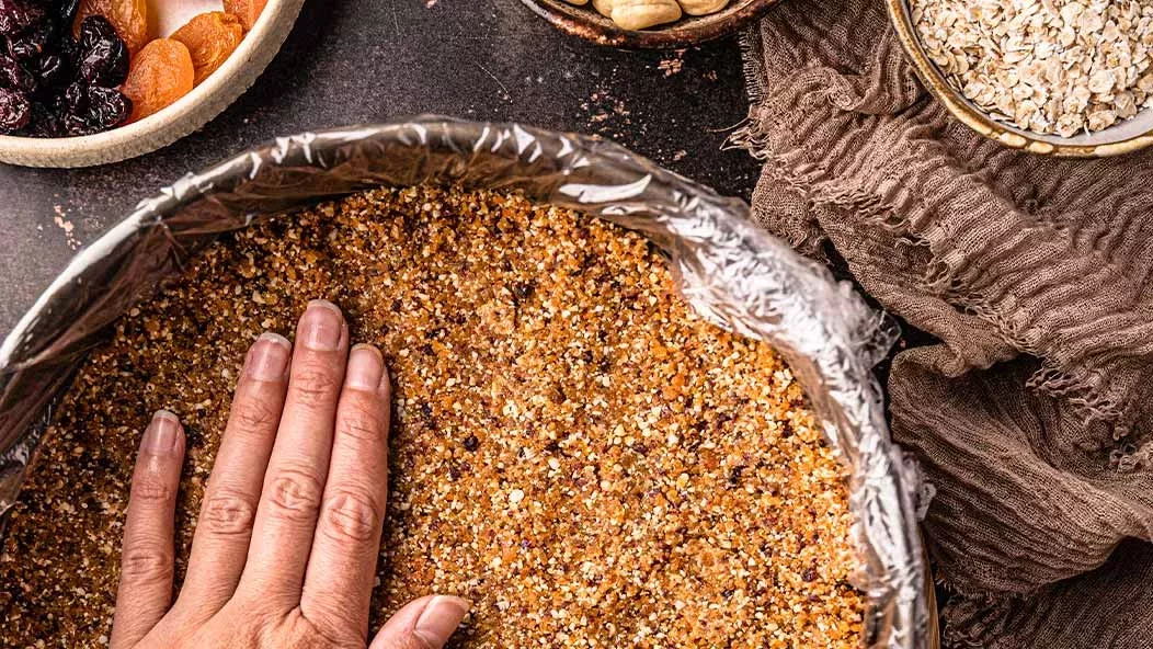 Bred ut den i tårtformen, jämna till den och tryck fast den i botten och sidorna av formen. Ställ den i kylen.