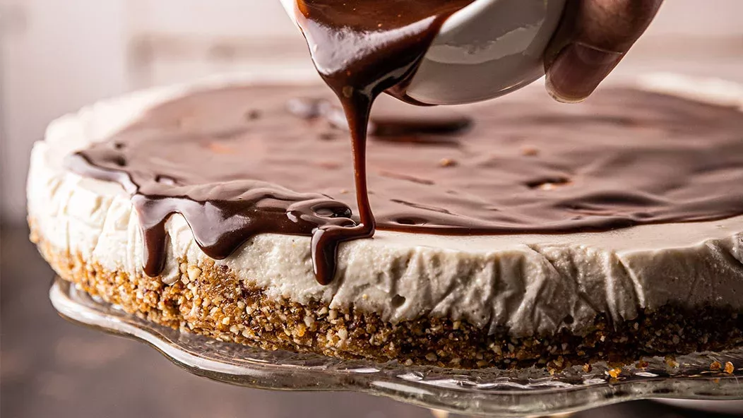 Kan cheesecake vara vegansk? Absolut! Cashewnötter fungerar perfekt. Prova "cheesecake" utan bakning gjord av cashewnötter på en lättsaltad nötbotten, översållad med en choklad-kolasås, berikad med Kikkoman naturligt bryggt sojasås.