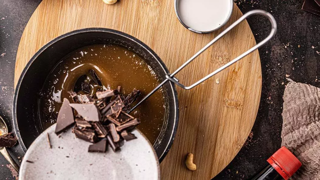 100 g strösocker – 50 ml varmt vatten – 100 ml kokosmjölk – 40 g kokosolja – 1 msk Kikkoman naturligt bryggd sojasås – 40 g mörk choklad