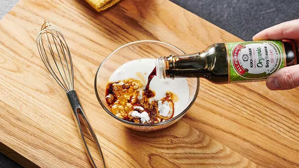 Rör ihop Kikkoman Naturligt bryggd ekologisk sojasås, kokosmjölken och maizenan i 250 ml vatten.
