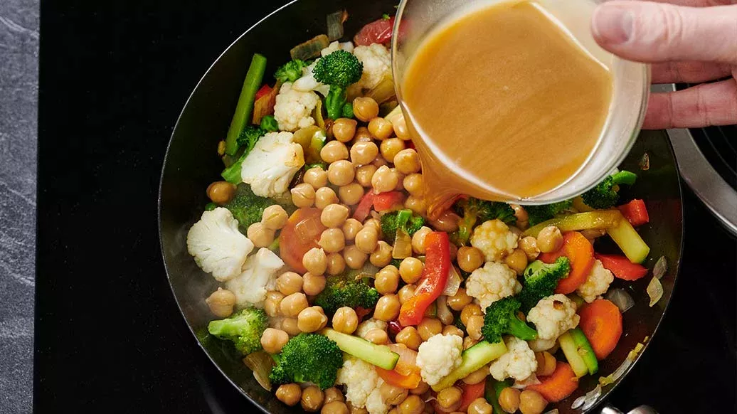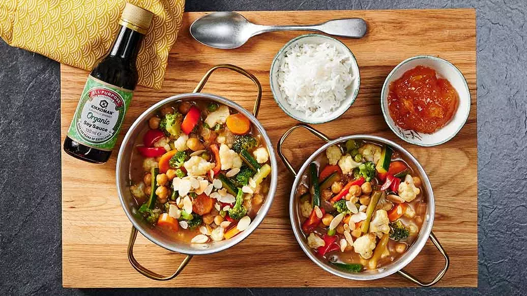 Hetta upp olja på medelhög värme i en wokpanna eller djup stekpanna. Tillsätt löken, ingefäran och vitlöken och en nypa currypulver och bräsera under omrörning i en minut. Tillsätt de grönsaker du vill ha och fräs upp under omrörning i 4 minuter – eller tills de är tillräckligt färdiga. Tillsätt och koka upp kikärtorna tillsammans med blandningen av Kikkoman Naturligt bryggd ekologisk sojasås, kokosmjölken och maizenan. Låt koka ca 1 minut under ständig omrörning tills kikärtorna är varma.