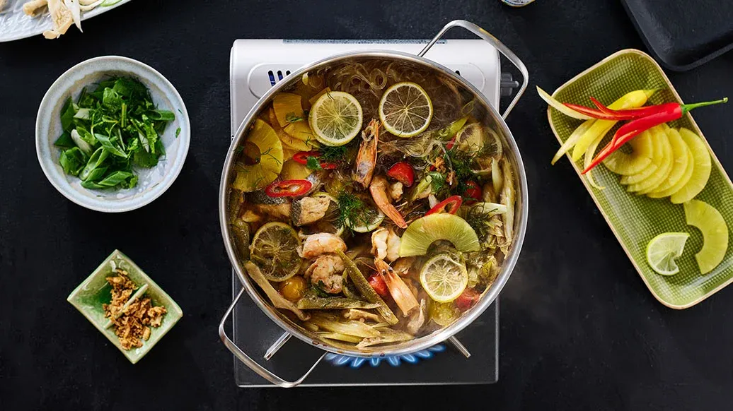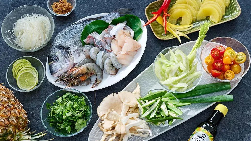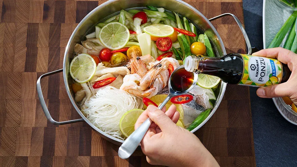 En canh chua-inspirerad sötsur fisksoppa med örter, skaldjur, grönsaker, ananas och tomater. Förfinad med Kikkoman Ponzu-citron är den lätt, aromatisk och perfekt att dela vid bordet.