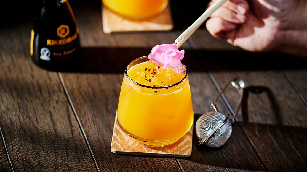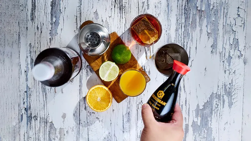 120 ml mandarinjuice – 80 ml limejuice – 40 ml pumpakryddsirap – 2 skvätt Kikkoman naturligt bryggd sojasås – 200 ml kallt rooibos vaniljte – 16 isbitar (isbitars vikt ca 20g)