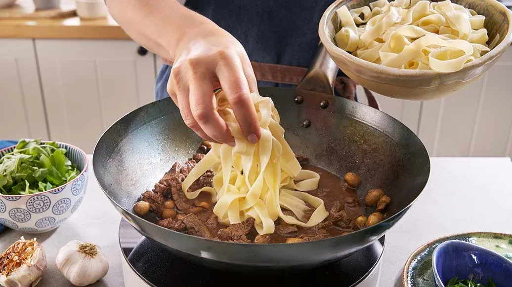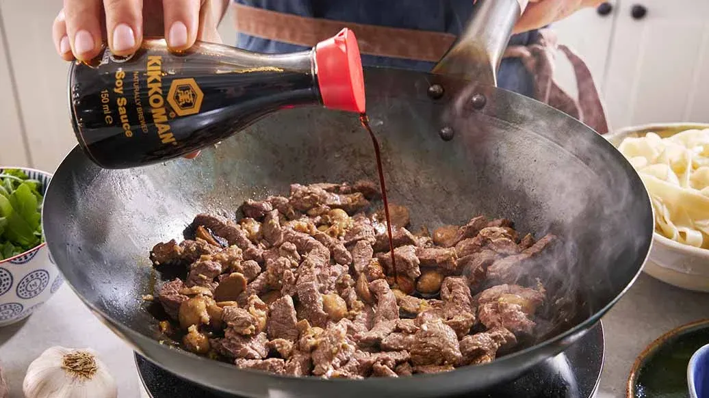 En rik och aromatisk wokrätt där Kikkoman sojasås framhäver smakerna av mört nötkött, rostad vitlök och champinjoner, vilket skapar en perfekt balans tillsammans med silkeslen tagliatelle.