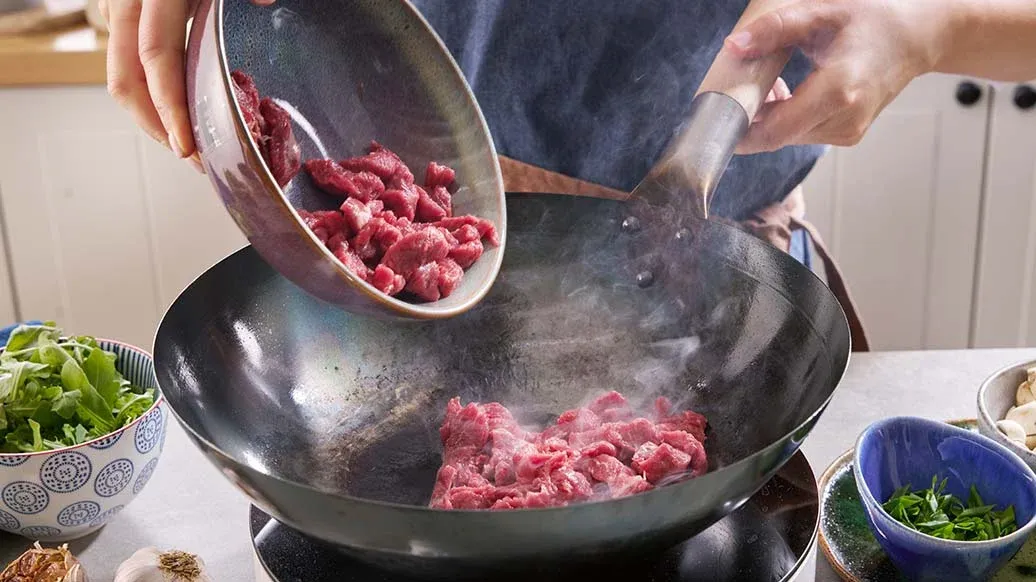 Värm en wokpanna, tillsätt oljan och nötfärsen och stek under omrörning i 2–3 minuter tills den är brynt. Ta ur pannan och ställ åt sidan.