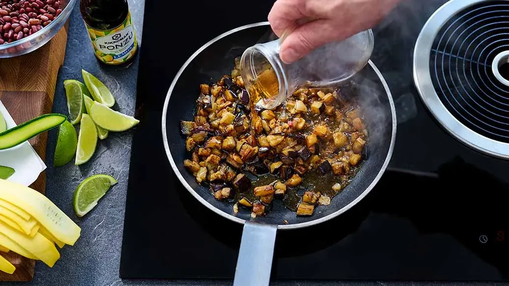 Skär auberginen och schalottenlöken i små tärningar och hacka vitlöken. Värm 1 msk olivolja och stek auberginen, schalottenlöken och vitlöken tills de är gyllenbruna. Deglasera med vinäger och Kikkoman Ponzu Citron. Rör i linfröoljan och krydda med peppar.