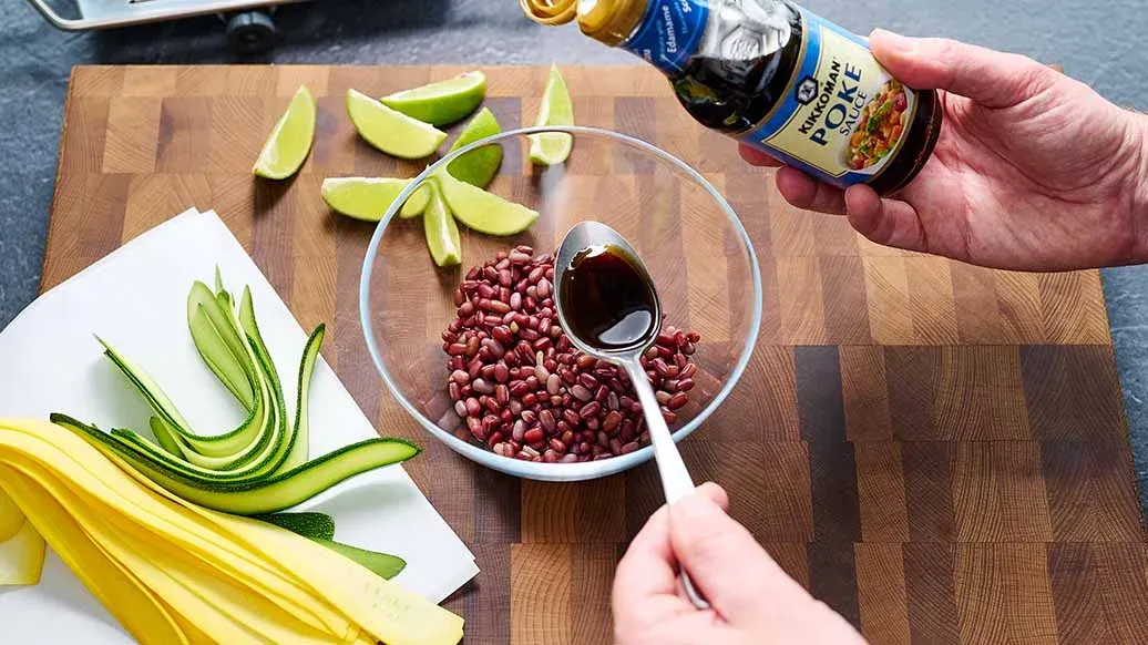 Skär zucchinin på längden i skivor eller strimlor. Marinera azukibönorna i Kikkoman-pokesåsen. Skär limen i åtta bitar.