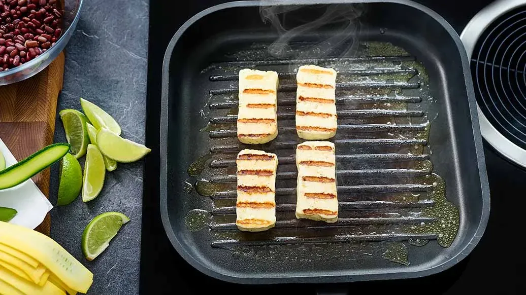 Perfekt för lunch, ett hälsosamt mellanmål på kontoret eller en fest i trädgården. Denna sallad med zucchini, azukibönor och halloumi serveras med en varm auberginevinägrett gjord på Kikkoman Ponzu-citron – fräsch, mättande och snabb att tillaga.