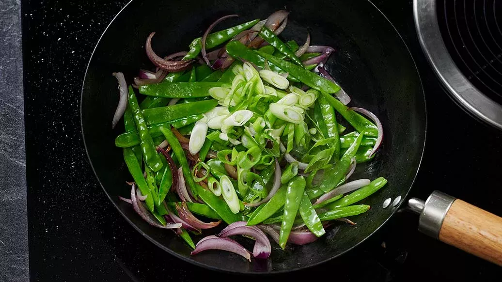 Tillsätt 1 msk olja i wokpannan, tillsätt lök och sockerärter och stek. Tillsätt vårlök och bryn. Ta bort allt och lägg åt sidan.