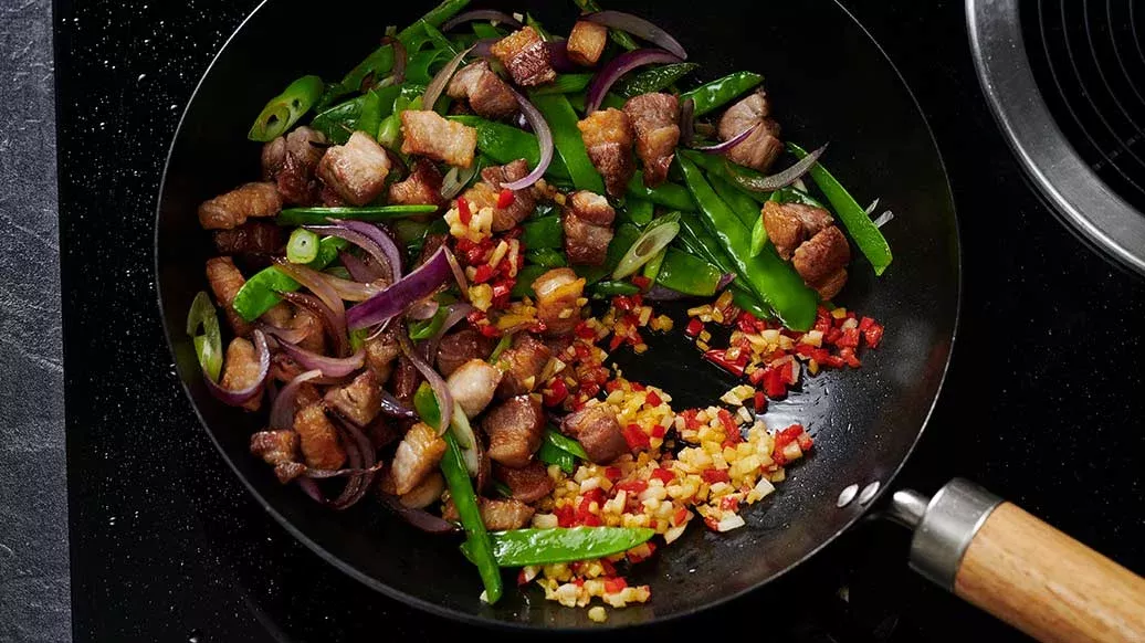 Hetta upp 1 msk olja i wokpannan, stek fläsket tills det är krispigt, ta bort och låt rinna av.