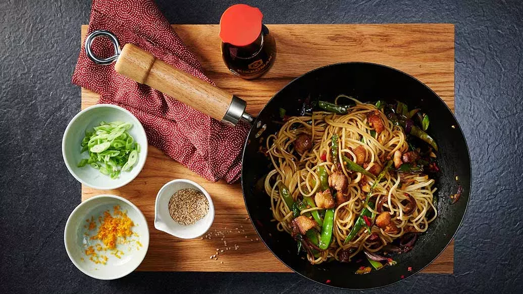 En högtemperaturvärme är viktig för wokmatlagning. Men var försiktig när oljan är varm - att tillsätta ingredienser som är fuktiga kan göra att det flammar upp eller stänker.