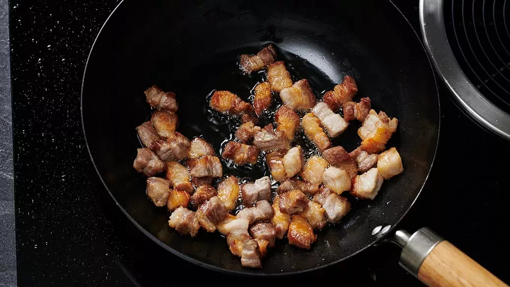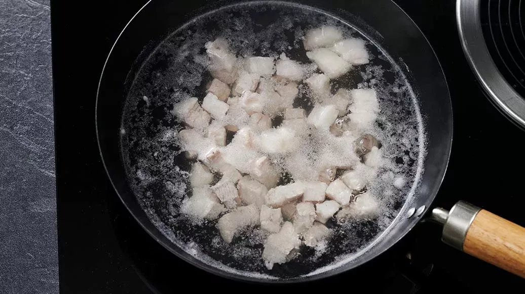 Koka upp vatten i en wokpanna. Tillsätt sidfläsket, koka i ca 10 minuter, ta bort och låt fläsket rinna av på hushållspapper.