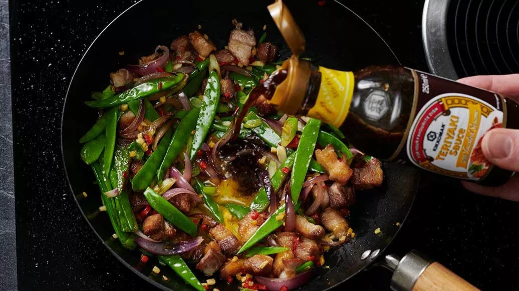 Tillsätt apelsinjuice, Kikkoman teriyakisås, Kikkoman sojasås och Kikkoman sesamolja.